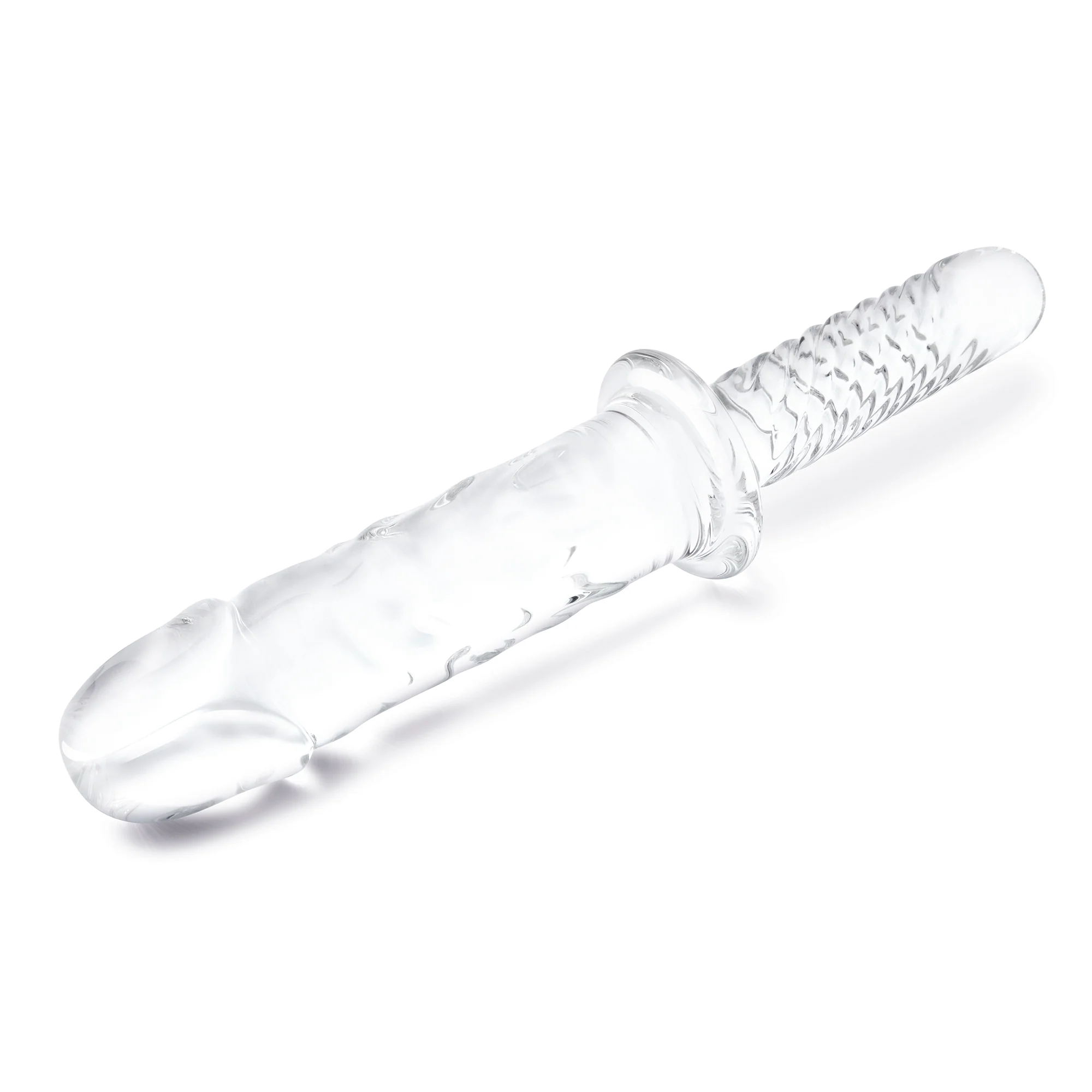 Get a double dip of dick with the 11" Girthy Cock Double Ended With Handle by Gläs. Get pummeled with the realistic glass end that is perfectly textured for internal massage and keep full control of your experience with the ergonomic handle. Flip over your fun filler for a bumpy sensational shaft that can help you explore stimulations, or be used with a partner.